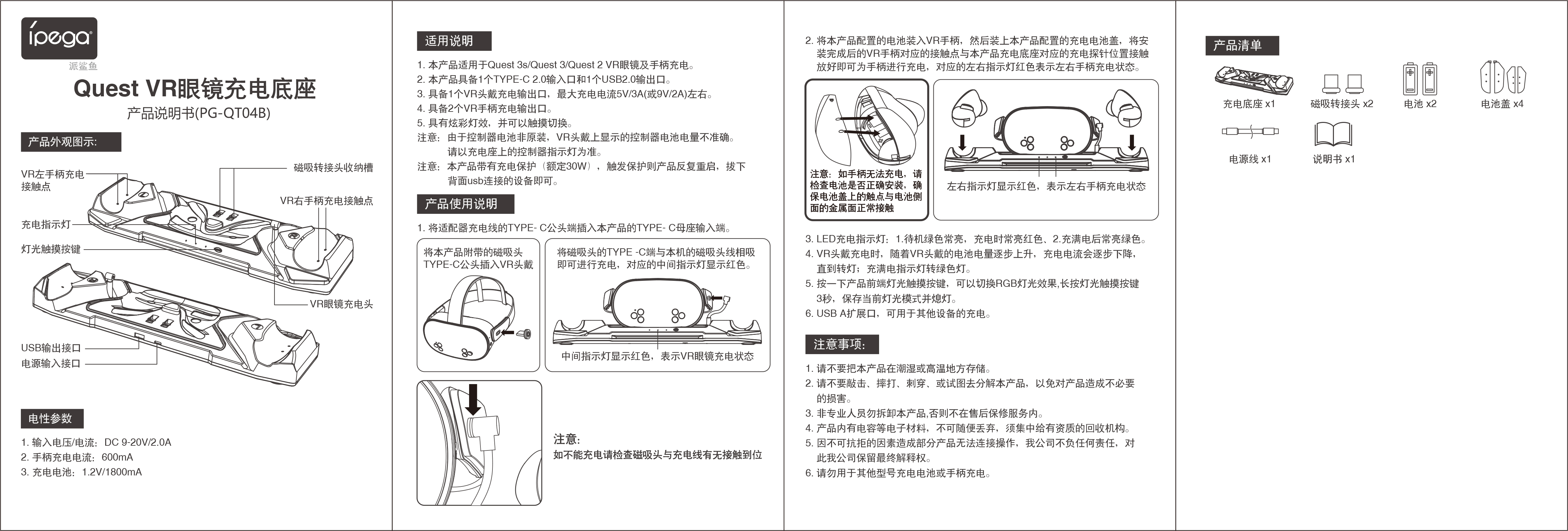 1. 本产品适用于Quest 3s/Quest 3/Quest 2 VR眼镜及手柄充电。